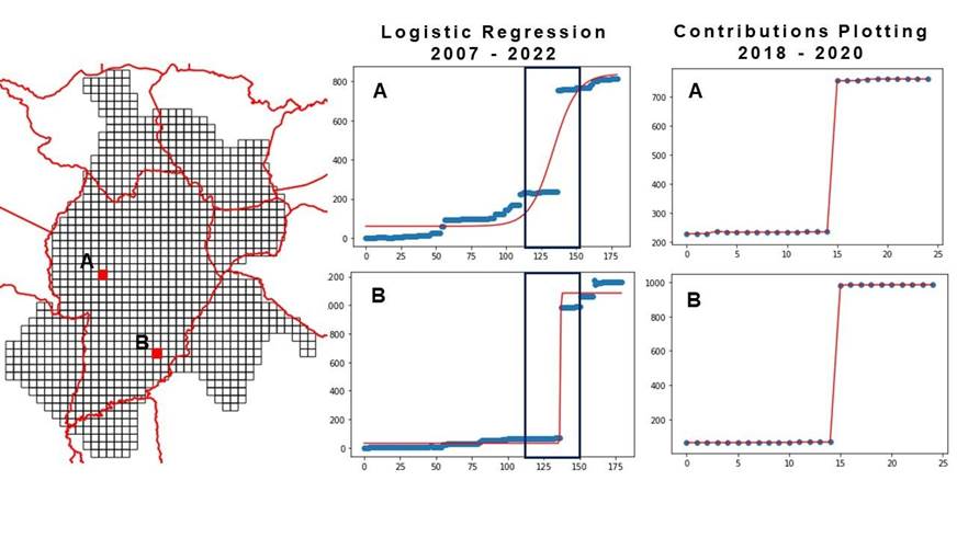 As shown in Figure 9, it is possible to note that address imports influenced the total accumulated contributions. In region A, 519 features were added in a single month during the period (2018-2020). This corresponds to 63.4% of the total accumulated number of features by 2022. In region B, the number of contributions in a single month was 916, corresponding to more than 78% of the available features. In addition, the logistic regression presented an overflow message, indicating an abrupt jump.