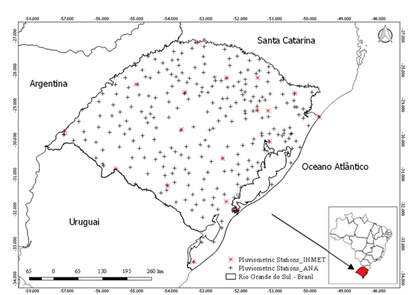 In this sense, one possibility is to use rainfall data from regions neighboring the state, such as ANA and INMET rainfall stations in southern Santa Catarina territory and western Argentina. Ceron et al. (2021), when carrying out the precipitation prediction in the La Plata Basin, which covers part of the territory of RS, showed that pluviometric precipitation data from stations located in Argentina can be used.