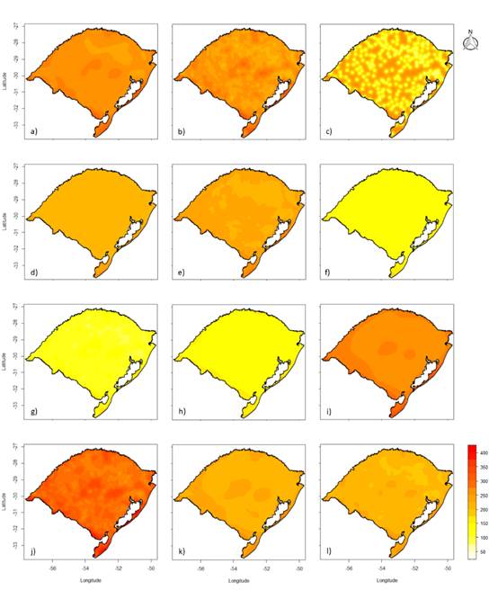 Figure 3 shows the kriging variance maps for the twelve months of the year, where it is observed that the January, February, September, and October stand out for presenting greater uncertainties (larger kriging variances) associated with the average estimates climatological, generating more heterogeneous rainfall estimates (maps with orange to red colors). Britto, Barletta and Mendonça (2006) observe that, in summer, it rains more in the Northeast region of RS, due to convective rains associated with the convergence zones of the South Atlantic, and that, in spring, it rains more in the Northwest of RS, where occur the mesoscale convective complexes. According to Campos and Eichholz (2011), the mesoscale convective complexes are associated with intense rainfall, strong gusts of wind, and hail, which leads to more heterogeneous rainfall.