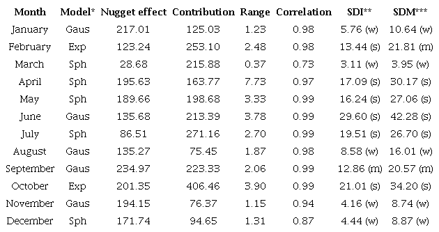 March and December are the months of greatest concern in the assessment of the spatial variability of rainfall, as they have lower correlation coefficients (between semivariances and the values predicted by the model) and are classified as having weak spatial dependence.