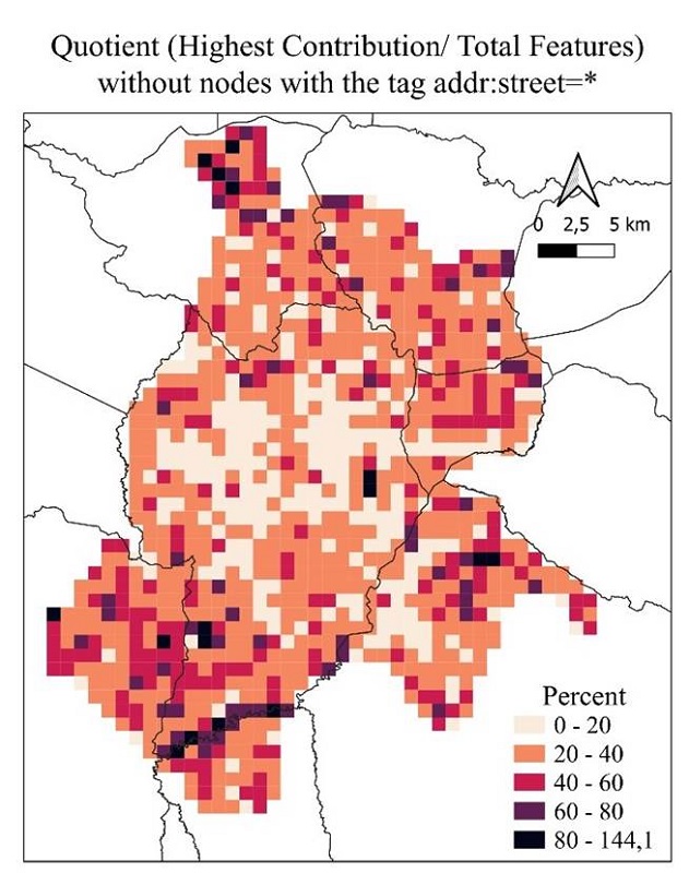 Therefore, when observing the distribution of contributions accumulated over time in heterogeneous regions, it is possible to observe patterns and behaviors that may help understand the dynamics of OSM contributions in a specific time and space. For example, the map in Figure 12 shows the spatial distribution of the month’s percentage with the highest contributions concerning the accumulated total after filtering the OSM address tags.