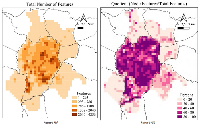 Based on the described methodology, 1074 cells with 1x1km had their behaviour evaluated. Figures 6 and 7 show the representation of the existing number of features in OSM and the quotient between the number of points features and the total number of features.