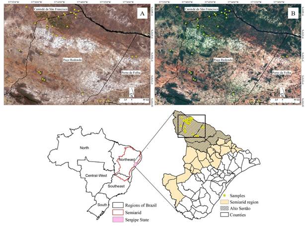The studied region is located in the Alto Sertão Sergipano Territory, with an area of approximately 4,900 km2 (Sergipe 2011, 2012), specifically in the municipalities of Canindé de São Francisco, Poço Redondo, and Porto da Folha, in the state of Sergipe. It has a semi-arid climate of low latitude and altitude, classified as BSh according to the Köppen classification (Alvares et al. 2014). The soil is classified as a Luvisol and Planosol (Embrapa 2011) comprised in reliefs dissected in hills and tabular interflows, with a pediplain surface located in the Sertão Pediplain (Sergipe 2012).