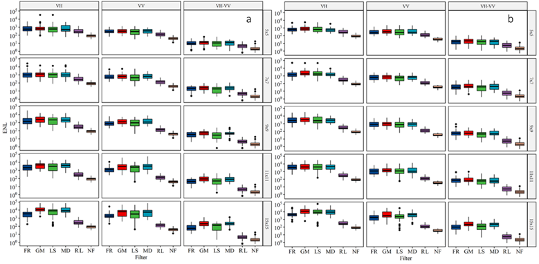 In the post-rainy season, the distribution of the ENL values of the filters in the different window sizes and polarizations has, in general, a standard upward curve to Median and a subsequent decrease to No Filter, being much more characterized as the size of the windows (Figure 2b). In general, the Gamma and Median filters stand out among the others, having their values in the 1st quartile, median and 3rd quartile above the other filters, thereby presenting their boxes, which contain 50% of the data, higher to the others.