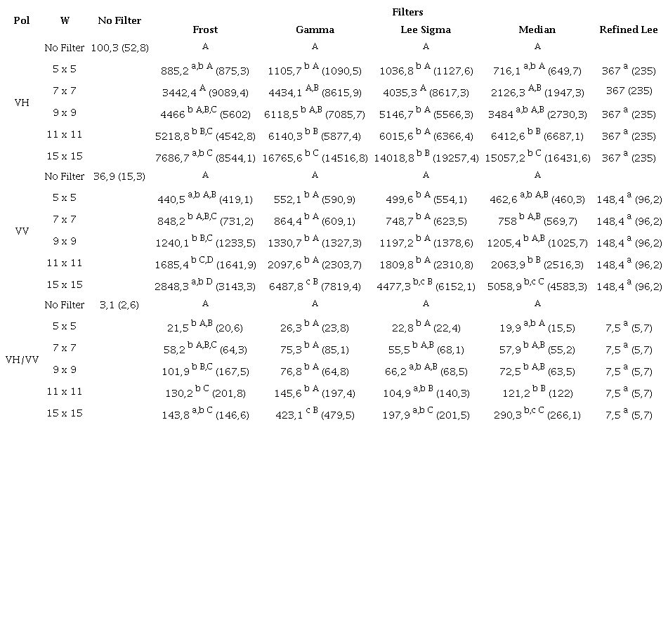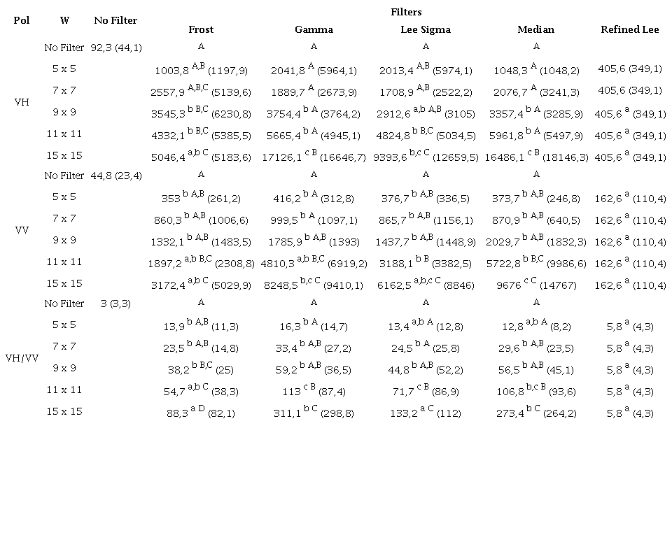 In the VV image, it was noted that there is a significant difference only between the Refined Lee filter and the others for the 5 x 5, 7 x 7 and 9 x 9 windows, with Gamma having the highest means for the first two and Median followed by Gamma for the abovementioned third window. The Median filter also stood out for the 11 x 11 and 15 x 15 windows, showing better results than the others. When analyzing the mean values between the windows in the filters, there is a similarity between the responses of the statistical test as the size of the windows increases, with emphasis on Gamma, which did not show similarity of the values in the 5 x 5 and 7 x 7 windows with the others.