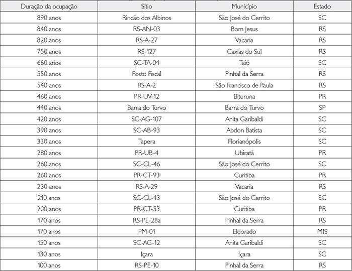 As evidências arqueológicas interpretadas a partir das informações históricas mostram que os Jê do Sul concentravam-se nos territórios mais elevados acima do nível do mar, onde predominam as temperaturas mais baixas e as áreas de campo intercaladas com a mata de araucária. A porção superior de boa parte dos vales que terminam no litoral atlântico estava ocupada pelos Jê, enquanto que a planície costeira das regiões Sul e Sudeste era domínio Tupinambá (ao norte da ilha do Cardoso) e Guarani (ao sul de Antonina). A região de Misiones possui poucas datas (Apêndice), e estas se estendem desde o século XIII até o século XVI – posteriores, portanto, à expansão Guarani no rio Paraná.
