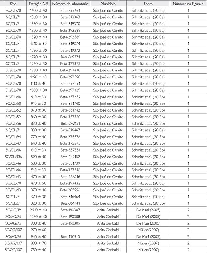 A permanência nos sítios leva a repensar o problema do tempo e da continuidade da ocupação, mesmo que as datas de certos sítios na Figura 4 aparentem claramente reocupações, e não uma presença contínua (e.g. SC-TA-04, Posto Fiscal, entre outros) (Schmitz et al., 2002, 2013b). Não é mais possível manter a interpretação de que os sítios seriam reocupados somente após um período de abandono. Por exemplo, devem-se considerar os estudos de solo antropogênico da Amazônia para testá-las em outros contextos: estimativas sobre o tempo de formação das terras pretas variam desde 1 a 0,002 cm por ano, mas o consenso recai sobre um processo lento, resultado de longa permanência (Erickson, 2003). Devem-se considerar os novos estudos cronológicos no Brasil de sítios continuamente ocupados (Fish et al., 2000; Martins; Kashimoto, 2000); pesquisas com novas abordagens estratigráficas e mais datas estão contribuindo para definir com precisão o processo de ocupação dos sítios (Saldanha, 2005; Copé, 2006; Copé; Saldanha, 2002). É curioso que evidências de longas ocupações datadas em sítios e regiões inteiras não sejam consideradas por alguns arqueólogos atrelados ao modelo padrão (Schmitz et al., 2002, 2013b). O conjunto de datas mostra a continuidade da presença Jê em algumas áreas: para facilitar a visualização desta continuidade, organizamos as datas conforme os municípios e, dentro de cada município, desde as mais antigas até as mais recentes; os municípios com maior número de datações são listados primeiro no Apêndice (ver também a Figura 3).