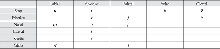 Moving now to the segmental phonology, the Terena consonantal inventory assumed here is given in Table 1. The inventory is broadly consistent with those proposed in published sources on the language (e.g. Harden, 1946; Ekdahl; Butler, 1979; Silva, 2008; Martins, 2009, p. 42) and with my own work in the field. The following points need comment: the opposition between n and ɲ is marginal, though is included here in view of pairs such as kêɲo ‘ear’ and éno ‘(his/her) mother’. Martins (2009) phonemicizes [w] and [v] as allophones of /v/, not of /w/. Though the difference is immaterial to the following discussion, I opted here for employing /w/ as the underlying segment.