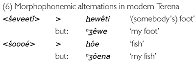 The point of the data in Table 5 is simply that of showing how this early written evidence helps cast light on the fact that s, ʃ > h yielded a merger with early Terena h. The modern Terena data in (6) above demonstrate that this merger was only partial. A fuller picture of these alternations, including internal reconstruction for modern Terena data and the tracing of the ‘life-cycle’ of the relevant changes, from their origins in allophonic variation to their eventual morphologization, is dealt with in Carvalho (in press).