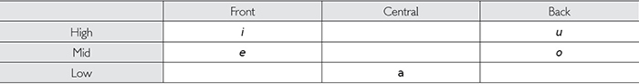 A conspicuous feature of Terena speech is the fact that both front and back mid vowels are frequently realized as mid-open [ɛ] and [ɔ], respectively. I will, however, follow most existing sources and employ e and o for representing the relevant phonemes. Harden (1946, p. 61) postulates two back unrounded vowels that she symbolizes as ï and ë. Since these are restricted to occur next to a glottal fricative h, I assume that Harden’s back unrounded vowels correspond to tokens of [ɨ] noted elsewhere in the literature to occur in this exclusive context (cf. Martins, 2009). Souza (2008) found a complementary distribution between [i] and [ɨ] in the Kinikinau variety4, thus treating both as allophones of /i/. The status of the restricted occurrences of [ɨ] in Terena – or even whether there is single phone [ɨ] as opposed to the two backed allophones described in earlier sources such as Harden (1946) – remains uncertain. As nothing in the present discussion or in the argument presented here depends on this issue, I will assume the general opinion that the language has no such segment in its phonological inventory (cf. Payne, 1991, p. 421, comment on etymology for ‘tail’; also Ekdahl; Butler, 1979, p. 13; Silva, 2008; Martins, 2009; Rosa, 2010, p. 66)5.