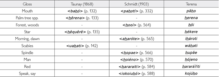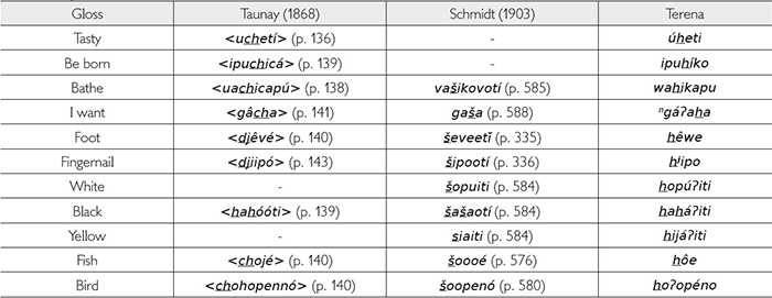 Matching segments in this and the following tables are given in underline, and each early Terena form is followed by a reference to the page number of the original work where it is attested. The only exception to the debuccalization change is the form for ‘black’ recorded by Taunay, showing <h> matching modern Terena h and Schmidt’s Guaná <š>. This could be seen as evidence either of dialect borrowing (see footnote 3) or of lexical diffusion of the debuccalization change as it was starting to gain footing in a few forms.