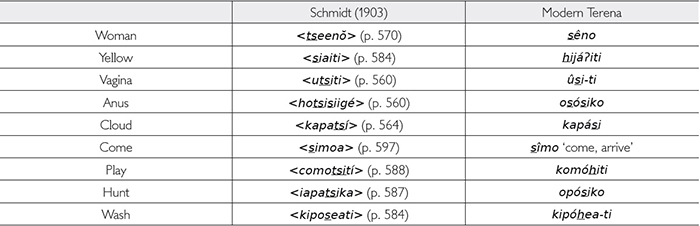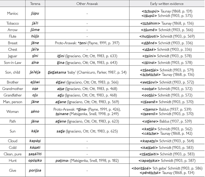 For the early Terena fricatives, matters are perhaps simpler. MS notes explicitly that his <s> = [s] (“französisches ç”; Schmidt, 1903, p. 332). For TN, arguments such as those above establish quite clearly that <s> =[s], though, preceding <i> and <e>, [s] is represented by <c> or <ç> in his script, again obviously based on conventions for writing Brazilian Portuguese, even if these conventions are inconsistently applied (cf. e.g. <sêni> ‘jaguar’(TN)).