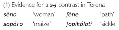 The Terena continuant obstruents will turn out to be particularly important for the argumentation that follows and merit, for this reason, a more detailed discussion. The language has two oral fricatives, a coronal-alveolar (or more anterior) fricative s and a coronal-palatal (or more posterior) ʃ (Harden, 1946, p. 62; Ekdahl; Butler, 1979, p. 13; Martins, 2009, p. 35). Their contrast is exemplified by forms such as: