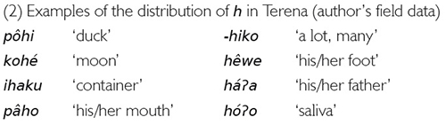 The glottal fricative has a restricted distribution in many Arawak languages, often occurring as a boundary marker (Aikhenvald, 1999, p. 79) and *h has a relatively uncertain status as a PA segment (at least in part of its distribution; cf. Payne, 1991, p. 455). In Terena, however, the glottal fricative is clearly part of the phononological inventory:
