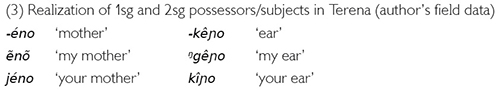 Before moving on, it is also necessary to discuss briefly an allophonic process of contextual obstruent voicing and an allomorphy pattern, both related to non-concatenative morphological processes in Terena, since early documentary data often show the effects of these morphophonological adjustments in ways that are not obvious from a simple inspection of accompanying glosses. As seen in Table 1, voicing is not a contrastive feature in Terena phonology. Nevertheless, obstruent consonants are contextually voiced in some contexts, the most important of these being related to the exponence of 1sg subjects (in verbs) and possessors (in nouns). The exponence of 1sg in Terena can be analyzed in terms of a floating [nasal] feature, or a ‘nasal prosody’ (see Bendor-Samuel, 1961; Eastlack, 1968, p. 4) that attaches to the left edge of a word and spreads rightward unless blocked by an obstruent consonant. In (3) below the root -éno ‘mother’ displays full rightward spread of nasality, while -kêɲo ‘ear’ displays the effect of the [nasal] feature being blocked by an obstruent, in this case the velar stop k. Note the creation of a short nasal on-glide plus the allophonic voicing of k as [g].