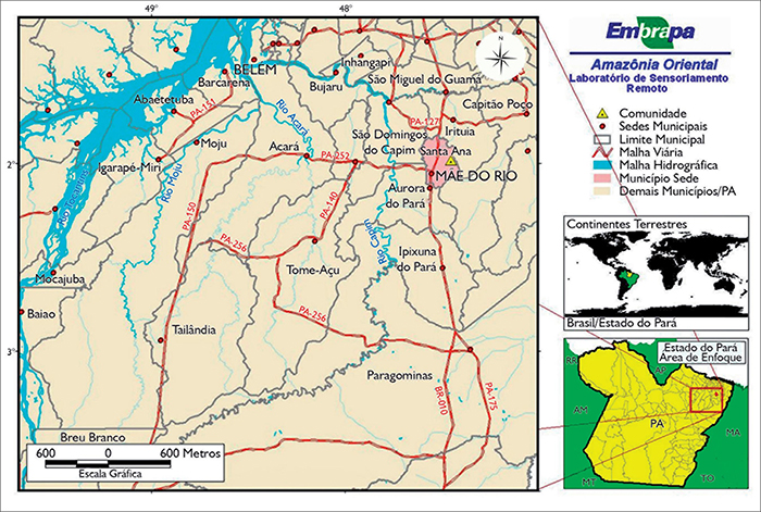 A pesquisa foi realizada em Santa Ana2 (Figura 1), uma das comunidades do assentamento Itabocal, no município de Mãe do Rio, Pará. A metodologia consistiu em um estudo de caso, com levantamento de dados secundários e históricos (atas de reuniões do Clube de Mães e da Coordenação Regional) e pesquisa de campo, por meio de observações do cotidiano local e de eventos cooperativos do grupo. Trinta e duas entrevistas não diretivas foram realizadas com moradores e lideranças, envolvidos nas diferentes formas de ação coletiva. Comparamos a experiência da ação coletiva e a manifestação da reciprocidade por meio dos mutirões das organizações dos agricultores familiares, que se diferenciam quanto ao tempo de origem, ao objetivo da criação e à forma de funcionamento.