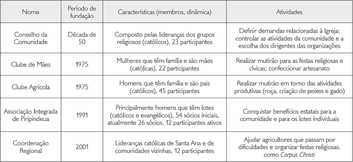 Eis as organizações existentes em Santa Ana, por data de fundação: o Conselho da Comunidade, o Clube de Mães, o Clube Agrícola, a Associação Integrada de Piripindeua e a Coordenação Regional (Quadro 1). Com exceção da Associação, todas foram fundadas por incentivo da Igreja Católica, cujo propósito geral era a evangelização. O Conselho da Comunidade destaca-se por ter sido a primeira iniciativa evangelizadora e de congregação de lideranças católicas residentes na localidade. Os clubes tratam de iniciativas de produção e atividades domésticas, interpretadas como de homens ou de mulheres e, consequentemente, reforçam os papéis segundo os quais, para garantir o bem estar da família, compete ao homem – o trabalho fora de casa – e à mulher – as tarefas domésticas. A Associação, entretanto, é oriunda de iniciativas vinculadas à execução de políticas públicas para os assentados. A Coordenação Regional é a organização mais recente, e visa a estabelecer o contato entre todos os católicos que fazem parte do assentamento. Os processos eletivos nas organizações criadas no âmbito da Igreja Católica eram realizados pelo grupo a partir da avaliação da participação do agricultor no mutirão e do cumprimento das suas obrigações cristãs; na Associação, diferentemente, levam-se em consideração os preceitos do regimento registrado em cartório.