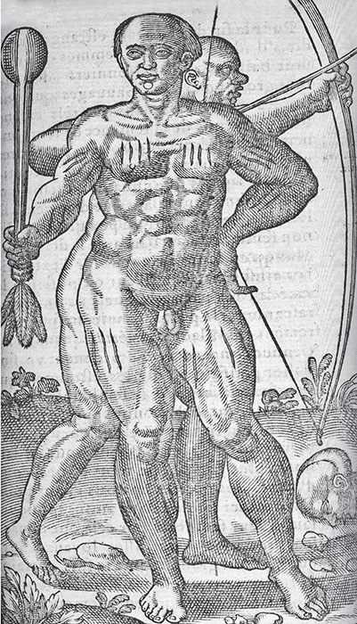 As for those who have committed these murders, they think that it is to their great glory and honor; the same day that they have dealt the death blow, they withdraw and have incisions made, to the point of drawing blood, on their chests, thighs, the thick part of their legs, and other parts of the body. And so that it may be visible all their lives, they rub these slits with certain mixtures and with a black powder that cannot ever be effaced. The more slashes they carry the more renowned they will be for having killed many prisoners, and they are consequently esteemed the more valiant by others. (So that you can understand this more clearly, I have repeated the illustration of the savage covered with slashes, next to whom there is another one drawing a bow.)22