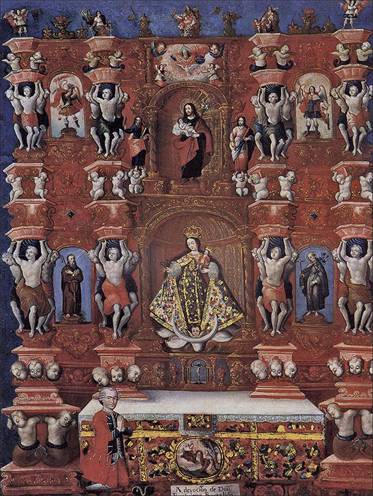 What the archive cannot answer is why a bishop would have become so interested in the scientific cause of certain birth defects. Was it solely that his interest in science was fostered by his colleagues, or was it also to deflect superstitious beliefs that might have been projected onto the boy by an uneducated population, including perhaps the boy’s parents, who were farmers from a neighboring village? Or might his particular malformation have elicited comparison with long established artistic conventions for representing angelic creatures, such as those supporting the feigned architecture in an anonymous retablo painted in Cuzco, of la Virgen del Carmen, 1776, now in the Lima Museo (Figure 6). Not that there is any actual historical connection between this particular altarpiece and Campeche’s painting, only that this naturalistic rendering of angelic creatures suggests that the resemblance between the actual Pantaléon and artistic representations of seraphim and cherubim might have been noticed at the time. Although the poignant expression that Campeche has given his sitter is suggestive – is it angelic? Is it expressive of a soul tragically trapped – there appears to be no way to resolve such historical questions about the effect of the painting on its original audiences into a single unambiguous reading.