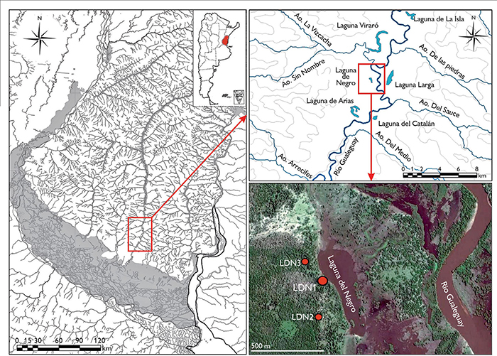 El sitio Laguna del Negro 1 (LDN1) se encuentra ubicado en el centro-este del departamento Gualeguay, provincia de Entre Ríos (32° 53’ 16’’S / 59° 09’ 49’’O). Forma parte de una localidad arqueológica compuesta por tres sitios (LDN1, LDN2, LDN3) ubicados en las inmediaciones de la Laguna del Negro, cuerpo de agua formado a partir de un meandro abandonado en la margen derecha del río Gualeguay (Figura 1). El paisaje donde se emplaza esta localidad corresponde, desde el punto de vista geomorfológico, a la unidad definida por Iriondo (1991) como Lomadas loéssicas de Crespo y puede caracterizarse como una llanura levemente ondulada cubierta por una capa de loess pleistocénico y disectada por valles fluviales con una orientación norte-sur. Debido a su posición topográfica relativamente elevada, estas llanuras recibieron escasa sedimentación holocénica, la cual quedó prácticamente restringida a las fajas aluviales locales (Iriondo, 1991). El más importante de los ambientes fluviales del área corresponde a la llanura aluvial del río Gualeguay. Este río presenta un avanzado estado de madurez geomorfológica, con un diseño meandroso y amplias planicies de inundación, donde se desarrollan numerosos reservorios de agua (lagunas y brazos abandonados) (Bianchi; Goniadzki, 2012).