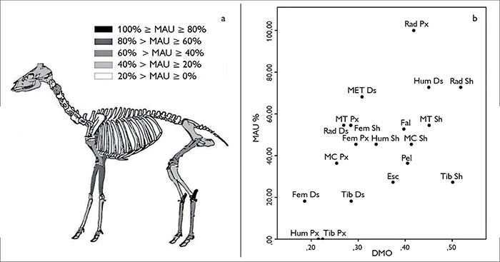 Se halló una correlación positiva y estadísticamente significativa (rho=0,518; p<0,05) entre el MAU% de Cervidae mediano y los valores densitométricos disponibles para oveja (Symmons, 2005) (Figura 2b). Por lo tanto, es posible concluir que la destrucción diferencial de las distintas unidades anatómicas, debida a procesos tafonómicos mediados por la densidad, es responsable, al menos en parte, del perfil esqueletario observado. Debido a esto, las correlaciones entre los valores de MAU% y los índices de utilidad fueron efectuadas considerando únicamente los elementos del esqueleto que presentan un elevado potencial de supervivencia, de acuerdo con la propuesta de Marean y Cleghorn (2003). No se hallaron correlaciones significativas entre el MAU% y ninguno de los índices considerados: MUI (rho=0,12; p>0,05), GUI (rho=-0,02; p>0,05), FUI (rho=0,08; p>0,05), IM (rho=-0,05; p>0,05). Es posible proponer entonces que la representación de partes esqueletarias no se encuentra condicionada por el valor nutricional de las distintas unidades anatómicas.