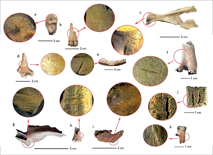 Las alteraciones de origen antrópico se detectaron sobre la mayoría de los taxones identificados en el sitio: cérvidos, roedores, dasipódidos, carnívoros, aves, reptiles, y peces. Entre los restos asignados a Ozotoceros bezoarticus y Cervidae mediano se detectaron huellas de corte sobre 10,6% de los especímenes óseos, correspondientes a vértebra (n=1), costilla (n=1), hemimandíbula (n=2), cinturas (n=3), epífisis y diáfisis de distintos huesos largos (n=17), tarso (n=8), carpo (n=1) y falanges (n=5) (Figura 3a-c). Estas huellas pueden vincularse a actividades de cuereo, remoción de tendones, desarticulación y descarne de las carcasas. Por otra parte, 19,16% de los restos de cérvido se encuentran termoalterados, ya sea quemados (5,83%), carbonizados (5,83%) o calcinados (7,5%). Las evidencias de acción térmica se registraron sobre diferentes elementos: huesos largos, carpianos, tarsianos, cinturas, vértebras, costillas, mandíbula y cráneo. Por último, los restos asignados a cérvidos se encuentran extensamente fragmentados (porcentaje de completitud=17,64%) y presentan valores de NISP:MNE de 1,84. Adicionalmente, una gran proporción de los huesos largos (73,61%) presentan bordes de fractura frescos. Entre ellos, predominan las fracturas longitudinales (55%), seguidas de las helicoidales (22,5%), oblicuas (17,5%) y transversales (7,5%). Además, en varios fragmentos diafisarios (11,9%) se registraron escotaduras y negativos de impacto.