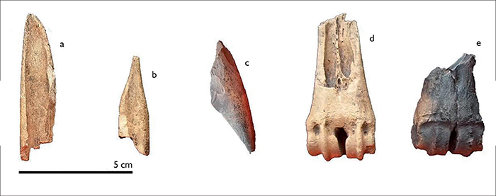 En LDN1 se detectaron un total de 11 restos óseos con evidencias tecnológicas. Tres de ellos corresponden a puntas de las que se conservan únicamente los extremos activos. Dos de ellas están elaboradas sobre metapodios de Cervidae, y la restante sobre un hueso largo de mamífero mediano-grande indeterminado (Figuras 4 a y b). La ausencia del extremo proximal de estos instrumentos impide asignarlas a un grupo morfológico más preciso. Por otra parte, se registraron tres lascas óseas, también indeterminadas, que presentan microlascados en sectores del borde de fractura (Figura 4c). En algunos casos, estos podrían corresponder a rastros de uso. Otros tres fragmentos diafisarios, también asignados a mamífero mediano indeterminado, presentan bordes de fractura pulidos. Se trata de restos muy fragmentarios, uno de los cuales podría corresponder a un fragmento de la base de un instrumento. Por último, se registraron dos extremos distales de metacarpos asignados a Ozotoceros bezoarticus con evidencias tecnológicas (Figuras 4 d y e). Estos presentan bordes de fractura pulidos y, en un caso, evidencias de aserrado oblicuo. Los extremos activos se encuentran demasiado fragmentados como para asignarlos a un grupo morfológico.