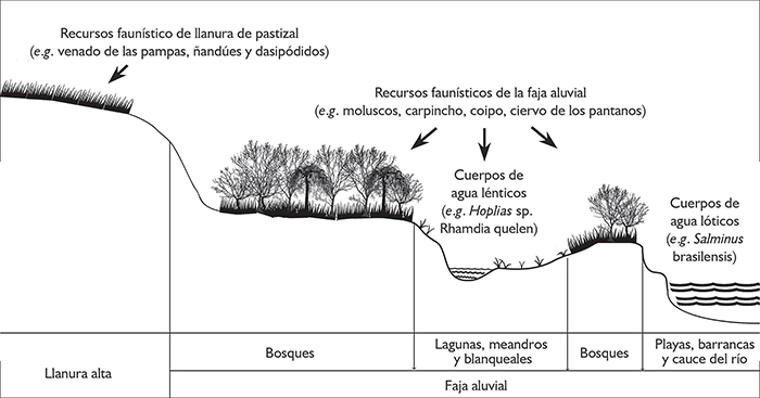 Posiblemente, la gran diversidad taxonómica registrada en LDN1 se deba, por un lado, a la explotación de recursos propios de los ambientes fluviales junto con aquellos disponibles en las llanuras abiertas y, por otro lado, al emplazamiento del sitio, en una laguna de la faja aluvial, la cual podría haber funcionado como un “concentrador” de recursos terrestres y acuáticos. El emplazamiento de campamentos residenciales en este tipo de geoformas es una característica recurrentemente observada en numerosos valles fluviales de ríos meandrosos, ubicados en ambientes tan distintos como el valle del río Negro en Argentina (Luschinger, 2006; Prates, 2007), el curso inferior del río Colorado en EE.UU. (Moore, 2000), el río Ganga en la India (Singh, 2004) o el río Vychegda en Rusia (Karmanov et al., 2013). En estos lugares, las lagunas desarrolladas en meandros abandonados (lagunas en herradura) funcionaron como atractores para el asentamiento humano debido a la abundancia y diversidad de recursos que presentan. Sumada a la disponibilidad constante de agua, la presencia de bosques de tala, ñandubay, espinillo y algarrobo en las márgenes de las lagunas del área de estudio probablemente brindó, además de frutos y semillas, reparo y abrigo, así como madera para la combustión y para la manufactura de herramientas. Las lagunas ofrecen también un ambiente de fácil captura de moluscos y peces dulceacuícolas. Su recarga cíclica durante períodos de crecida del río Gualeguay, cuando funcionan como reservorio y atenuante de las inundaciones (Bianchi; Goniadzki, 2012), evita la sobreexplotación de sus recursos al incorporar nuevos ejemplares provenientes del cauce principal (Sinha; Jha, 1997; Bappa et al., 2014). Asimismo, en períodos de bajante, los peces de estas lagunas son fáciles de atrapar al encontrarse en cuerpos de agua de poca profundidad. En este sentido, es interesante señalar el aprovechamiento en los sitios arqueológicos de peces tanto de ambientes lénticos (e.g. tararira y bagre sapo) como de ecosistemas lóticos (e.g. dorado). Asimismo, estas lagunas constituyen el hábitat de una variedad de recursos semi-acuáticos (e.g. coipo, carpincho, aves acuáticas) y funcionan como atractores de otros animales que las utilizan como abrevaderos y/o áreas de depredación. Así, la importancia biocenótica de las lagunas en herradura ha sido ampliamente reconocida, en tanto conforman ecosistemas que contribuyen significativamente a la biodiversidad, especialmente cuando se encuentran asociadas a bosques riparios (Koc et al., 2009; Chakrabarty et al., 2010; Špoljar et al., 2011). Asimismo, los grupos que ocuparon LDN1 explotaron también los recursos propios de las llanuras de pastizales abiertos (e.g. Ozotoceros bezoarticus y Rhea americana), ubicadas en zonas más altas y alejadas de los mayores cursos de agua (Figura 5). Durante las prospecciones desarrolladas en el departamento Gualeguay, no se detectaron sitios arqueológicos en estos ambientes de llanura. Sin embargo, existen numerosos hallazgos aislados que consisten fundamentalmente en elementos de caza, tales como bolas de boleadora y puntas de proyectil (Apolinaire, 2017). Esto, sumado a la evidencia arqueofaunística de LDN1 y otros sitios de las fajas aluviales (Apolinaire et al., 2016), permite proponer el uso de las llanuras altas como áreas de caza para los grupos que ubicaron sus campamentos residenciales en los cursos fluviales.