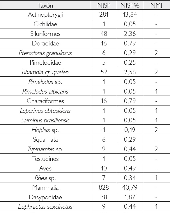 En cuanto al registro ictioarqueológico, una gran cantidad de restos (n=281) fueron incluidos en la categoría Actinopterygii, por tratarse de elementos óseos poco diagnósticos (principalmente vértebras y radios) y pequeños fragmentos óseos indeterminados. Los Siluriformes predominan sobre los Characiformes y Perciformes. Los especímenes asignados a Siluriformes indeterminados consisten principalmente en espinas, fragmentos de neurocráneo y otros restos muy fragmentarios. La familia Doradidae está representada fundamentalmente por espinas y dentículos así como restos de neurocráneo (mesetmoides, frontales, infraorbital) y cintura (cleitro) que pudieron ser asignados a Pterodoras granulosus. Entre los pimelódidos predomina Rhamdia cf. quelen, que es la especie mejor representada del conjunto ictioarqueológico. Los restos de bagre sapo corresponden a prácticamente todos los elementos del esqueleto e incluyen un neurocráneo articulado que se recuperó in situ durante la excavación. También se identificó Pimelodus albicans a partir de un cleitro, mientras que otros restos fueron asignados a Pimelodus sp. (hiomandibular) y Pimelodidae indeterminado (restos de cintura y espinas). El conjunto asignado a Characiformes incluye varios restos indeterminados, mientras que otros especímenes pudieron ser asignados a Hoplias sp. (premaxilares e interopercular), Salminus brasiliensis (premaxilar) y Leporinus obtusidens (diente). Los Perciformes están representados únicamente por un dentario correspondiente a Cichlidae.