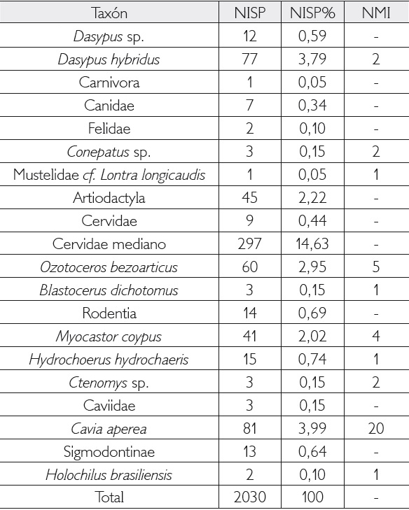 El conjunto óseo analizado, procedente de las 10 cuadrículas de la excavación, comprende 2030 especímenes. Además se recuperaron 1343 restos malacológicos, 188 fragmentos de cáscara de huevos de Rheidae y 2599 fragmentos óseos indeterminados menores a 2 cm. Debido a que estos últimos restos carecen de atributos para su identificación anatómica y taxonómica y presentan un tamaño pequeño que imposibilita el relevamiento de ciertas variables (e.g. meteorización), no fueron considerados en los análisis cuantitativos y tafonómicos posteriores. Entre los mamíferos predominan los cérvidos, particularmente Ozotoceros bezoarticus, con un NMI de 5 calculado a partir de los calcáneos (Tabla 1). A partir del estado de fusión de estos elementos, se pudo identificar la presencia de al menos un individuo juvenil. Otro cérvido de tamaño similar a Ozotoceros bezoarticus, cuya área de distribución natural incluye el área de estudio, es Mazama gouazoubira. Debido a las similitudes morfológicas entre estos taxones, la identificación de los restos de cérvido mediano incluyó la comparación con series de individuos de diferente edad y sexo, de ambas especies. Dada la ausencia de rasgos diagnósticos en varios elementos anatómicos y el estado fragmentario de la muestra, una gran cantidad de especímenes óseos (n=297) no pudieron ser asignados con seguridad a ninguna de estas dos especies y fueron incluidos en la categoría Cervidae mediano. Los elementos más diagnósticos y completos fueron asignados en todos los casos a Ozotoceros bezoarticus. El otro cérvido identificado en el conjunto arqueofaunístico es Blastocerus dichotomus, representado únicamente por dos fragmentos de hemimandíbula y un centrotarsal. Por otra parte, cabe destacar también que los restos asignados a Artiodactyla y Mammalia corresponden en su gran mayoría (95%) a fragmentos de diáfisis de huesos largos, fragmentos de tejido esponjoso axial y apendicular y otros restos sin atributos diagnósticos para su identificación, pero con un tamaño comparable al de los cérvidos medianos.