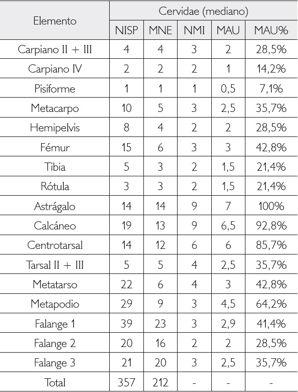 Para el estudio del perfil esqueletario de Cervidae, las medidas de abundancia anatómica fueron calculadas a partir de los restos asignados a Ozotoceros bezoarticus y Cervidae mediano (n=357). Teniendo en cuenta que solo se identificó Ozotoceros bezoarticus entre los cérvidos medianos (a partir de los elementos más diagnósticos y completos) se consideraron ambas categorías taxonómicas en conjunto con el objetivo de no sesgar la representación de los elementos menos diagnósticos.