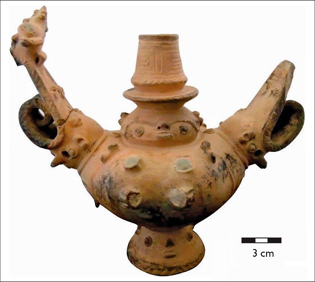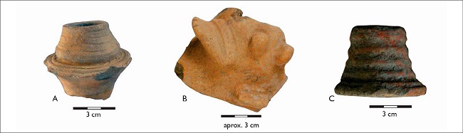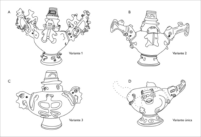 A diferença entre esses apliques reflete-se na composição geral dos vasos de gargalo, o que nos levou a diferenciar três variantes e uma peça única (Figura 6). Quantitativamente, entre vasos inteiros e fragmentados, são conhecidos mais vasos de gargalo com apliques da primeira variante (37 peças) do que das outras duas (respectivamente, sete e quatro peças). Algumas peças apenas apresentavam o negativo desses apliques, o que impossibilitou a identificação de qual tipo foi colocado no vaso.