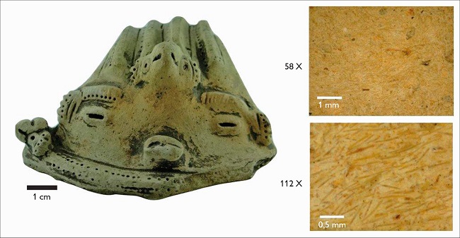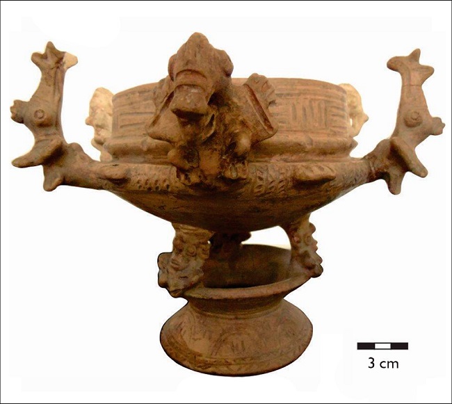 Há, portanto, dois tipos de modelagens figurativas muito particulares por sua padronização e que aparecem em grande proporção em coleções cerâmicas provenientes tanto do baixo Tapajós quanto da região do rio Trombetas. Os apliques aviformes vêm sendo associados à forma dos vasos de gargalo quando encontrados em coleções de cerâmica Santarém (Gomes, 2002) ou no sítio Porto (Schaan; Alves, 2015), na cidade de Santarém. Da mesma maneira, os apliques quadrúpedes batraquiformes podem ser associados a essa morfologia de vasilha que em seu corpo combina os dois tipos de aplique em questão em Santarém. O mesmo poderia ser pensado com peças encontrado em outras áreas?