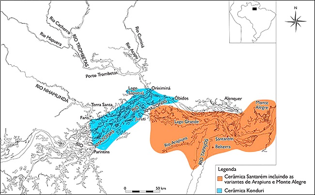 A questão da relação entre os produtores das cerâmicas Santarém e Konduri tem sido tratada desde o início do século passado e continua em aberto. Nimuendajú (1949, 2004) foi o primeiro a identificar, entre 1923 e 1926, a cerâmica Konduri e propor que a sua dispersão ocorre da região dos rios Trombetas e Nhamundá alcançando até a serra de Parintins (Figura 3). O lago Salé, próximo ao lago Grande de Curuaí, seria uma ‘fronteira’, segundo Nimuendajú, uma vez que o autor encontrou nesse lugar peças Santarém e Konduri.