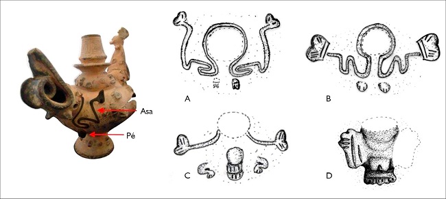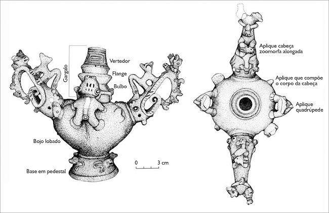 Vários nomes já foram atribuídos ao que chamamos de vaso de gargalo (Nordenskiöld, 1930; Palmatary, 1939; Serrano, 1938), mas a denominação que se perpetuou foi aquela atribuída por Barata (1950). Apesar da permanência do termo ‘vaso de gargalo’, Barata o usou para agrupar duas morfologias distintas, as quais, segundo nossa concepção, apenas compartilhavam gargalo constrito com flange: uma mais padronizada (‘tipo 1’ do autor) e outra com formas muito distintas, com bojos zoomorfos ou antropomorfos (‘tipo 2’ do autor). Em trabalhos posteriores (Guapindaia, 1993; Gomes, 2001), a categoria foi usada apenas em relação ao conjunto mais padronizado. Os vasos de gargalo, assim, são vasilhas cuja estrutura é dividida em três partes (gargalo, corpo e base em pedestal) (Scatamacchia et al., 1996), sendo que exibem um gargalo constrito e composto, além de apliques em formas de cabeças zoomorfas alongadas, geralmente em um eixo de simetria perpendicular a outro, no qual aparecem figuras quadrúpedes (Figura 5). O bojo de muitos vasos de gargalo é lobado, formando seis ‘gomos’. Em nosso estudo, constatamos que os vasos medem entre 10 e 30 cm de altura e têm uma capacidade volumétrica entre 250 e 670 ml. As partes estruturais deles refletem a sua construção em ‘blocos’ manufaturados separadamente e posteriormente unidos com barbotina e ranhuras. Essas vasilhas, a julgar por exemplares fragmentados, combinam um bojo feito por acordelamento e modelagem, afixado a outras partes completamente modeladas.