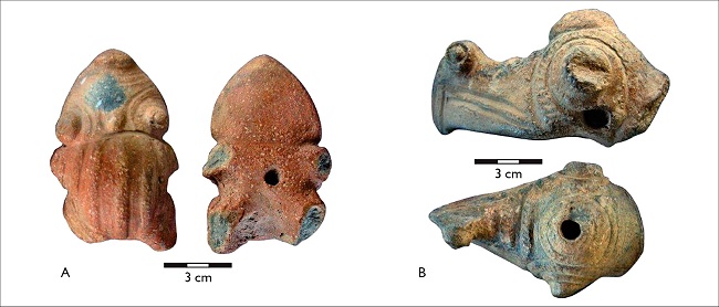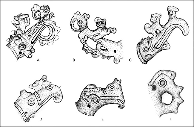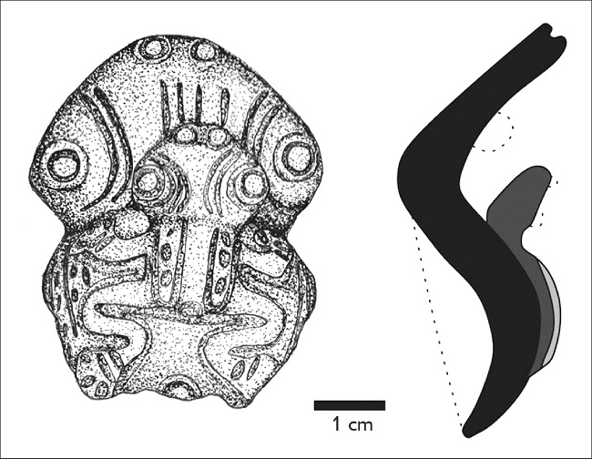 Os apliques em forma de quadrúpede sempre apresentam cabeça subtriangular e corpo elíptico (Figura 9), variando muito menos do que os ‘apliques-asas’. Os olhos desse tipo de figuração são sempre aplicados com um ponteado circular e o dorso, com variadas incisões e/ou filetes. O ventre desses apliques é sempre côncavo. Geralmente, essas figuras são identificadas como batraquiformes (‘sapos’ ou ‘rãs’). Essa identificação é justificada principalmente pelas patas traseiras fletidas, que lembram as de anuros.