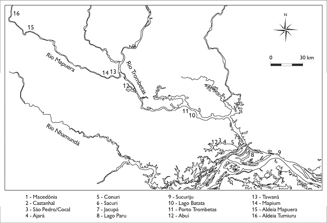As coleções estudadas possuem diferentes informações de proveniência (Figura 11). A coleção Walter Marinho não apresenta nenhuma informação sobre onde foram coletadas as peças, porém a maioria exibe características tipicamente Konduri. Na coleção Comissão Rondon/Barbosa Faria, na maioria dos casos, é disponibilizado o nome da comunidade/sítio arqueológico onde as peças foram coletadas, apesar de essa informação ter se perdido em um número pequeno de espécimes. Na coleção Comissão Rondon, há peças provenientes de proximidades de Óbidos (Sucuriju), da margem esquerda da foz do rio Trombetas (Sacuri, Jacupá, lago Paru), do lago Sapucuá (Ajará e Cocais) e do médio Trombetas (Abuí e Santa Maria). O material reunido pelo engenheiro Aricy Curvello vem da área de médio/baixo curso do rio Trombetas (Porto Trombetas, Aimim e lago Batata) e das proximidades do lago Sapucuá (Terra Santa).