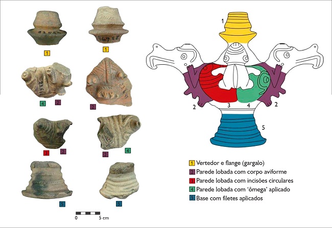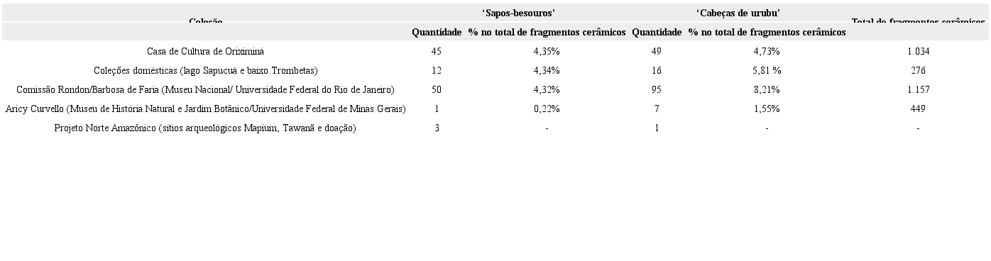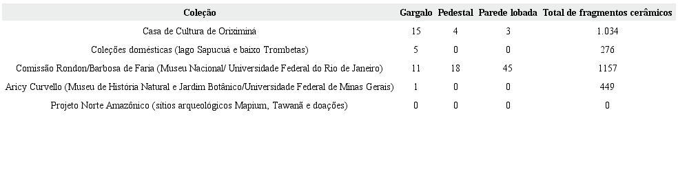 A maioria dos vasos de gargalo encontrados na cidade de Santarém (sítio Aldeia) possui vertedor com padrões incisos e flange, bulbo, corpo lobado, bem como apliques, que compõem o corpo dos seres figurados nos ‘apliques-asas’, além de base em pedestal ou zoomorfa. O exame das coleções domésticas e de museus mostrou uma abundância de fragmentos equivalentes às partes dos vasos de gargalo, o que confirma a existência desses vasos na região do rio Trombetas (Tabela 3; Figuras 12 e 13). A consulta a pranchas da bibliografia mostrou que peças análogas já haviam sido coletadas por Nimuendajú (2004) nas áreas dos lagos Sapucuá e Grande de Vila Franca. Recentemente, também foram coletadas peças semelhantes em escavações sistemáticas na bacia do rio Trombetas (Guapindaia, 2008, p. 166, fig. 42-g; Scientia, 2013, p. 72).
