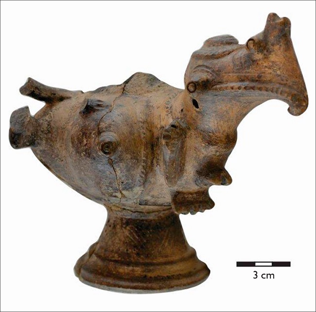 Um elemento muito importante – geralmente esquecido nas descrições dos vasos de gargalo – é a sugestão de um corpo para cada uma das cabeças alongadas a partir de pequenos apliques no bojo (Figura 8). Filetes, semiesferas e trapezoides sugerem um corpo de ave (com asas, patas e cauda) para a cabeça alongada. Todos esses elementos levam a considerar que, apesar das distintas identificações zoológicas feitas para as cabeças, é possível que se trate de uma variação de uma mesma personagem – apenas com exceção da variante única (Figura 6D).