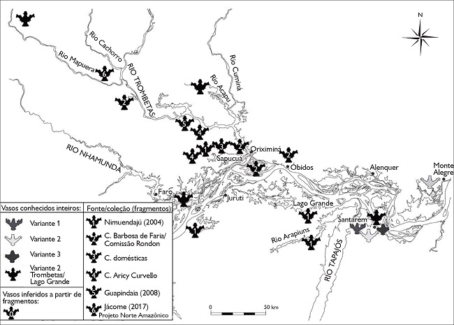 Os vasos de gargalo inteiros e os fragmentos são encontrados, principalmente, na área de dispersão das cerâmicas Santarém - incluindo o lago Grande de Curuaí - e Konduri, especialmente na bacia do rio Trombetas (Figura 18). Há poucas informações sobre o vaso de gargalo da coleção de Frederico Barata (1953b), cuja proveniência é indicada como sendo o município de Monte Alegre. Nimuendajú (2004) coletou peças com características Santarém em Monte Alegre, mas nenhum fragmento que pudesse ser associado a vasos de gargalo5. Os outros dois vasos inteiros, encontrados em afluentes do rio Trombetas, foram localizados em áreas com pouca ou nenhuma informação arqueológica. No caso do rio Mapuera, a maioria dos dados restringe-se à parte do curso do rio Mapuera mais abaixo da aldeia Tamiurú, sendo que não temos conhecimento de nenhuma pesquisa realizada no rio Acapu. No baixo curso do rio Mapuera, os apliques ‘cabeça de urubu’ e ‘sapos-besouros’ aparecem associados a uma cerâmica com atributos característicos da Tarumã (Glória, 2017; Jácome, 2017). Há alguns indicadores de presença de vasos de gargalo na coleção reunida por Nimuendajú (2004) em áreas nas quais não aparecem as cerâmicas Santarém ou Konduri, mas se trata de apenas uma peça no rio Arapiuns.