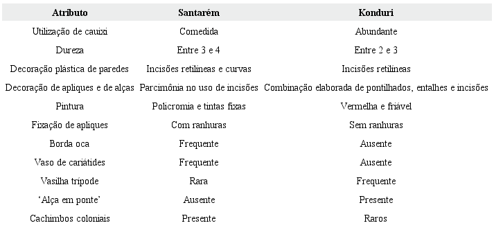 Hilbert, P. (1955) definiu as características da cerâmica Konduri e a diferenciou da Santarém a partir de um quadro com 11 traços (Quadro 1). Nenhuma revisão explícita foi feita ao quadro comparativo das cerâmicas Konduri e Santarém, porém é possível notar que alguns dos atributos comparados precisam ser relativizados ou mesmo descartados. O caso mais evidente é o da presença de cachimbos angulares, pois hoje sabemos que foram feitos no período colonial (Barata, 1952; Symanski; Gomes, 2012). Todavia, pelo menos cinco diferenças elencadas continuam sendo válidas, sendo a principal delas a porcentagem muito alta de cauixi na pasta Konduri (Figura 4), em oposição à grande concentração de caco moído e à menor proporção de cauixi na cerâmica Santarém (Gomes, 2002). Outras características que podemos mencionar, a partir de Guimarães (1985), Guapindaia (2008), Souza (2014), Panachuk (2016a) e do próprio estudo das coleções, são: maior frequência e elaboração da policromia na cerâmica Santarém, em contraposição à raridade de pintura na cerâmica Konduri; abundância de vasilhas trípodes no estilo Konduri, sendo muito raras na outra cerâmica; ausência de incisões curvas em Konduri, oposta à sua abundância na Santarém; e também ausência de vasos de cariátides na cerâmica dos rios Trombetas e Nhamundá. Apesar do diálogo direto com a caracterização da cerâmica Santarém feito por Barata (1950, 1953a), não há nenhuma referência aos vasos de gargalo na comparação feita por Hilbert, P. (1955).