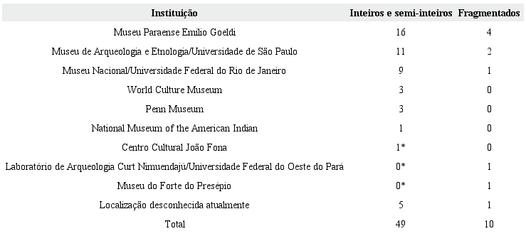 A partir de levantamento da bibliografia e de coleções do Museu Paraense Emílio Goeldi, do Museu Nacional/Universidade Federal do Rio de Janeiro e do Museu de Arqueologia e Etnologia/Universidade de São Paulo, foram identificadas 49 peças inteiras ou semi-inteiras, as quais apresentam o conjunto de elementos característicos dos vasos de gargalo (Tabela 1). Outras oito peças encontram-se fragmentadas, apresentando, aproximadamente, entre 40 e 50% das partes estruturais e dos apliques que compõem o vaso. Desse total, foram analisados 36 vasos Santarém inteiros/semi-inteiros e oito fragmentados, presentes nas três instituições com as maiores coleções de cerâmica Santarém no Brasil. Fotografias e descrições das outras peças mencionadas foram compiladas em outros estudos sobre a cerâmica Santarém (Serrano, 1938; Palmatary, 1960; Barata, 1950, 1953b; Nimuendajú, 2004; Corrêa; Barry, 2002; Leal; Amaral, 2011; Gomes, 2016; Jácome, 2017).