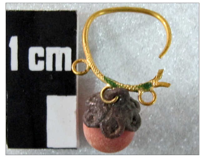 Embora a camada se tenha formado efetivamente nos últimos anos de ocupação do convento, ela correspondia a terras de remoção para a reutilização do espaço como ossário. Por isso, a peça em questão enquadra-se cronologicamente entre o século XVII e início do século XIX. Trata-se de um aro de ouro, com forma aberta e três argolas no lado exterior, apresentando, nessa zona, uma decoração de linhas incisas. De uma dessas argolas, pende um pingente composto por capucha polilobulada de metal prateado, com vestígios de sobredourado, aplicado sobre uma conta modelada globuloide de cor vermelha-opaca e totalmente lisa (Figura 6)27. É possível que os outros aros tivessem igualmente algum tipo de adorno, assemelhando-se muito ao perfil de um brinco de três lágrimas que esteve em voga durante todo o século XVIII (Figura 7). Nesse caso, a ausência de representações de monjas com este tipo de complemento sugere que a peça terá pertencido a uma secular, quem sabe a uma das ‘meninas’ protegidas por alguma monja ou por alguma benfeitora. Não se deve descartar ainda a possibilidade de não ser um brinco e ter pertencido à decoração de uma das coroas ou ramos que as monjas colocavam durante a cerimônia de profissão ou quando eram enterradas (Figuras 8 e 9).