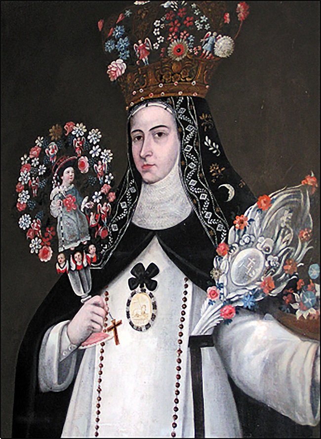 Através dos registos arqueológicos sabe-se que as monjas foram enterradas sem mortalha e com os dedos das mãos entrelaçados. O vestido consistia no hábito, um avental, uma touca e um véu, do qual se preservaram fragmentos de rendas em fio de cobre e maguey, complementados com adornos bastante exuberantes que atendiam à solenidade da ocasião (Salas Contreras, 2005). Desses adereços conservaram-se fragmentos das coroas e do ramo que se colocava junto a um braço. Ambos estavam feitos em fio de metal, alguns com banho de prata, que se cobriam com tiras de papel e eram decorados com flores naturais, de papel ou em massa. Além destas peças, foi comum o uso de um medalhão ao peito e, em um dos casos, o seu bordado com contas ficou registado em um fragmento de cal29. Hoje em dia conservam-se vários desses exemplares no Museo Nacional de Historia (MNH), desde modelos menores até peças mais elaboradas (Figuras 10 e 11) que encontram paralelo na pintura (Figuras 8 e 9 respectivamente). Complementando os acompanhamentos funerários colocava-se um rosário, geralmente sobre o ombro esquerdo, o qual era feito à base de contas, terminando em forma de cruz e de cujos braços pendiam três medalhas.
