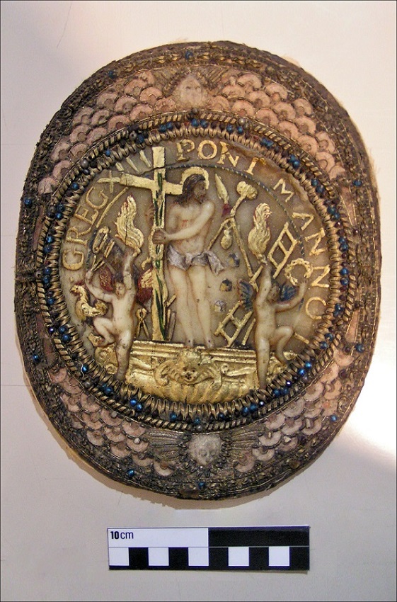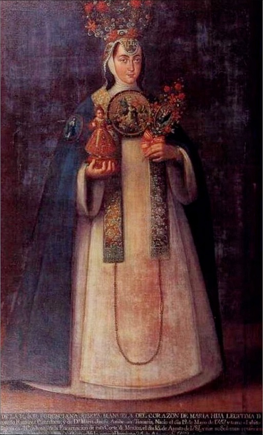 A sepultura eterna requereu cuidados especiais com o corpo e o seu adorno, particularmente das monjas de hábito negro que tinham um status superior. Os acompanhamentos e a forma como se associaram estiveram sujeitos às convenções da ordem e expressam uma sensibilidade negociada entre mulheres religiosas para se apresentar condignamente ante Deus. Além do rosário, que constituiu um dos elementos mais quotidianos da vida no convento e através do qual se levava a conta das orações, o vestido era cuidadosamente elaborado, incluindo arranjos florais e bordados de contas de vidro. Segundo alguns autores, esta arte foi introduzida, ou pelo menos fomentada, no convento (Castelló Yturbide; Mapelli Mozzi, 1998), onde as espanholas ensinaram as índias a bordar diferentes roupas, nomeadamente para a decoração das casas ou de alfaias religiosas, como as que ainda hoje se encontram em diversos museus mexicanos. Mas o mais pertinente para o caso que nos ocupa é a possibilidade de os escudos bordados com missangas terem sido executados por elas, como parte dos labores próprios da mulher da elite novo-hispânica ou fruto do seu processo educativo nessas artes.