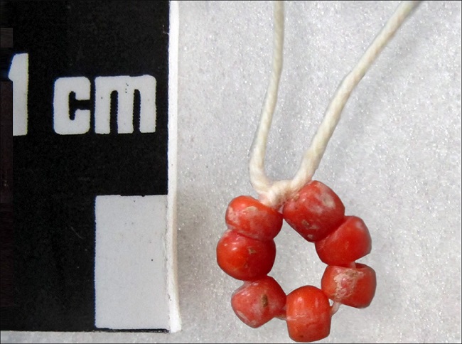 Na sepultura 39 detectaram-se sete contas de vidro, modeladas, globuloides e de pequenas dimensões, de cor vermelho-opaco e ainda com os respectivos remates pertencentes à correia metálica que os uniria (Figura 12)30. Devido às condições de preservação do original desconhece-se o seu modelo, sugerindo-se a possibilidade de tratar-se de uma simples correia, colar ou terço de finais do século XVI e início do século XVII. Nesta época as joias vermelhas estiveram em voga entre as classes privilegiadas, sendo que o seu uso entrou em decadência no século posterior, quando as pérolas ganharam destaque entre as elites e passaram a ser associadas ao adorno próprio dos grupos populares. Estas dinâmicas reproduziram as tendências da moda peninsular e acreditava-se que este material possuía poderes mágicos para garantir a proteção do indivíduo, tanto física como espiritual. Essas propriedades transferiram-se a todas as contas vermelhas, nomeadamente às de vidro, e a presença destes exemplares em um contexto arqueológico associado a doenças infecciosas cobra um sentido especial (Martins Torres, 2016).