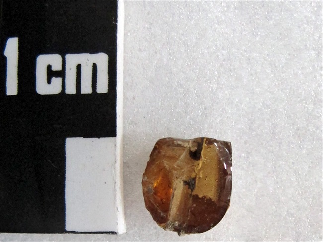 As contas referidas são bastante diferentes dos dois fragmentos de uma peça modelada, de forma ovoidal, encontrados na sepultura 53. Ela foi elaborada em vidro translúcido, com uma fina capa dourada e sem qualquer decoração impressa (Figura 13)31. A técnica com que se executaram é muito semelhante à das contas registadas na lixeira da enfermaria, onde se aprofundará toda a discussão que este tipo gera atualmente.