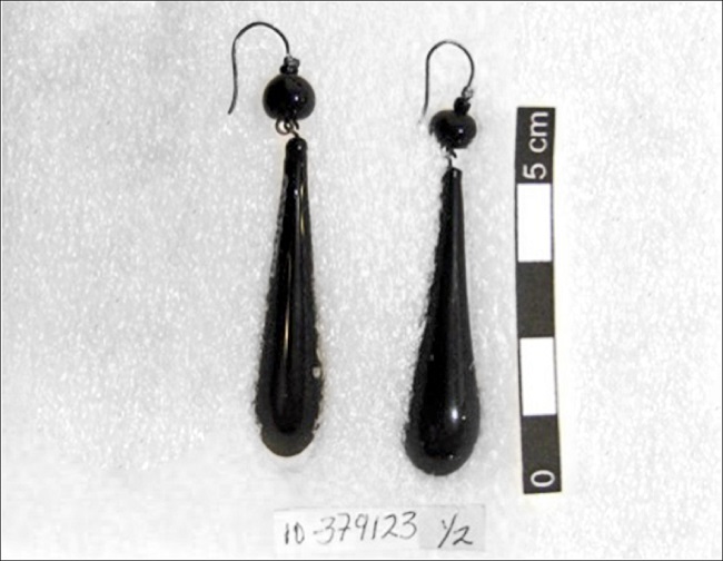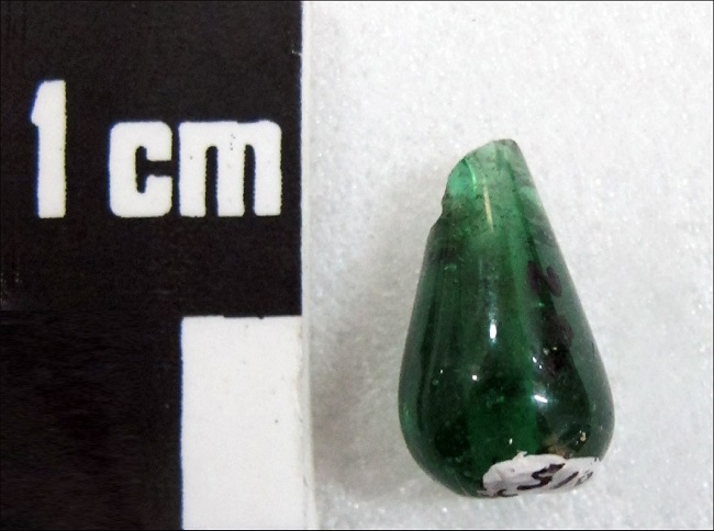 No interior das sete criptas localizadas na igreja detectaram-se vários níveis de enterramentos que pertenceriam a indivíduos de uma mesma família, confraria ou irmandade, a quem estava dedicado o altar situado por cima das mesmas (Salas Contreras, 1996a)32. Em uma delas recuperou-se uma conta modelada em forma de pingente e com extremidade mais larga e acabamento côncavo (Figura 14)33. Ela está elaborada em um vidro verde translúcido, bastante fino e sonoro pelo qual se deduz a sua qualidade, mas a ficha que a acompanhava não refere o número da unidade de escavação onde foi recolhida. Neste sentido, não se poderão tecer maiores considerações sobre o exemplar, sabendo-se apenas que se encontrava depositado em níveis de entulho da cripta, podendo pertencer originalmente a um brinco (Figura 15) ou a um adorno de qualquer objeto de arte decorativa.