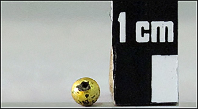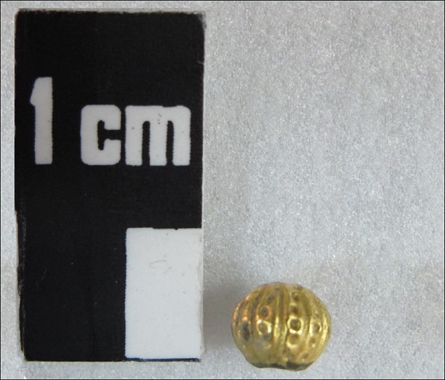 Dos vinte exemplares encontrados, todos foram elaborados por modelagem e treze deles estão recobertos com uma capa dourada. Desses, dez têm forma globuloide e um apresenta forma globular. Este grupo está composto por sete exemplares que não possuem qualquer decoração impressa (Figuras 16 e 17)35, dois que mostram um padrão composto por linhas incisas (Figuras 18 e 19)36 e dois que possuem decoração de linhas incisas alternadas por linhas perladas (Figura 20)37.