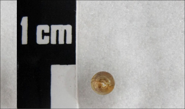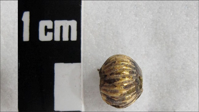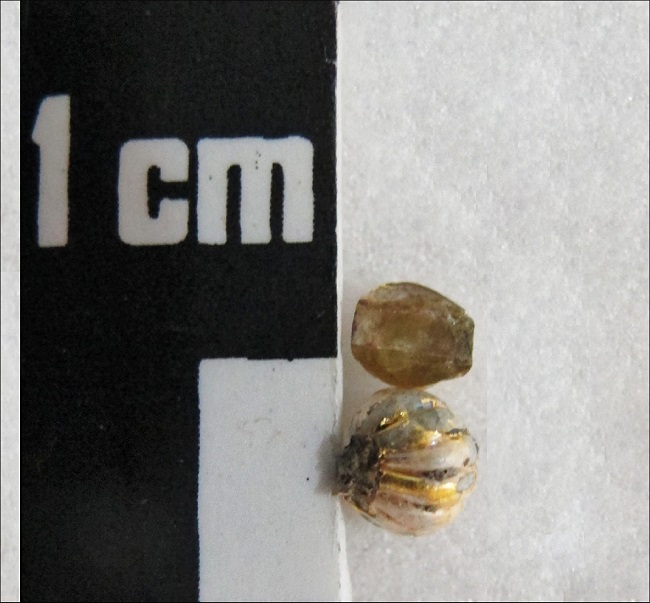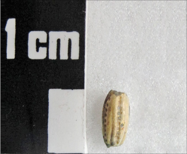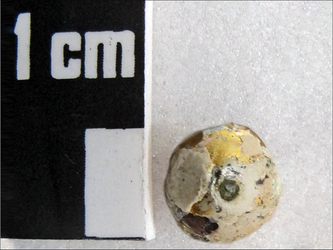 Existem ainda peças únicas, como uma de forma romboidal sem decoração (Figura 21)38 e outra ovoidal, decorada com linhas incisas e perladas intercaladas (Figura 22)39. Devido à cobertura, é difícil determinar a cor exata do vidro com que foram elaboradas ou detectar características particulares da sua composição. Pelo que se observou em zonas a descoberto, elas foram feitas com um vidro esverdeado e translúcido, com exceção de duas peças de tom amarelado, também transparente, que correspondem ao tipo globular e globluloide sem decoração impressa (Figura 17)40.